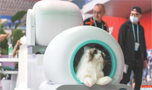 一家中国工业设计企业在第133届广交会上展示的全自动猫砂盆等宠物电器。新华社发