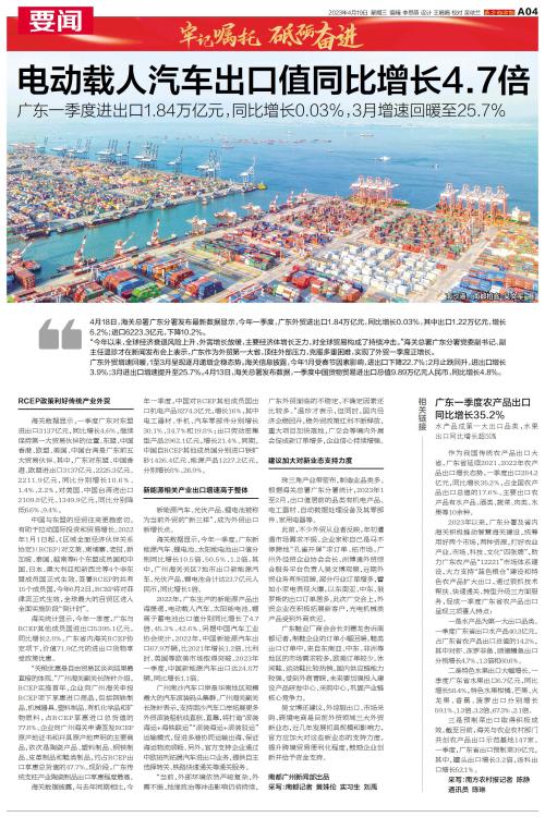 今年一季度,广东外贸进出口1.84万亿元,同比增长0.03%,其中出口1.22万亿元,增长6.2%;进口6223.3亿元,下降10.2%。