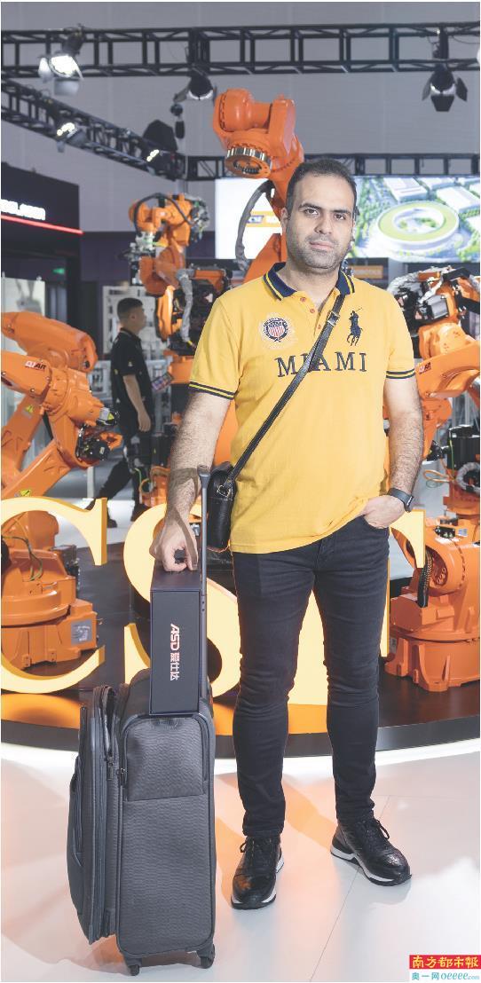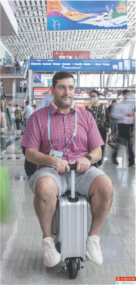 这是卡塔尔建筑材料商Abdulla Ahmad Aa Albaker第六次参加广交会。一款售价为2300元的可充电、可骑行的行李箱让他爱不释手,“十分适合我的业务需求。”