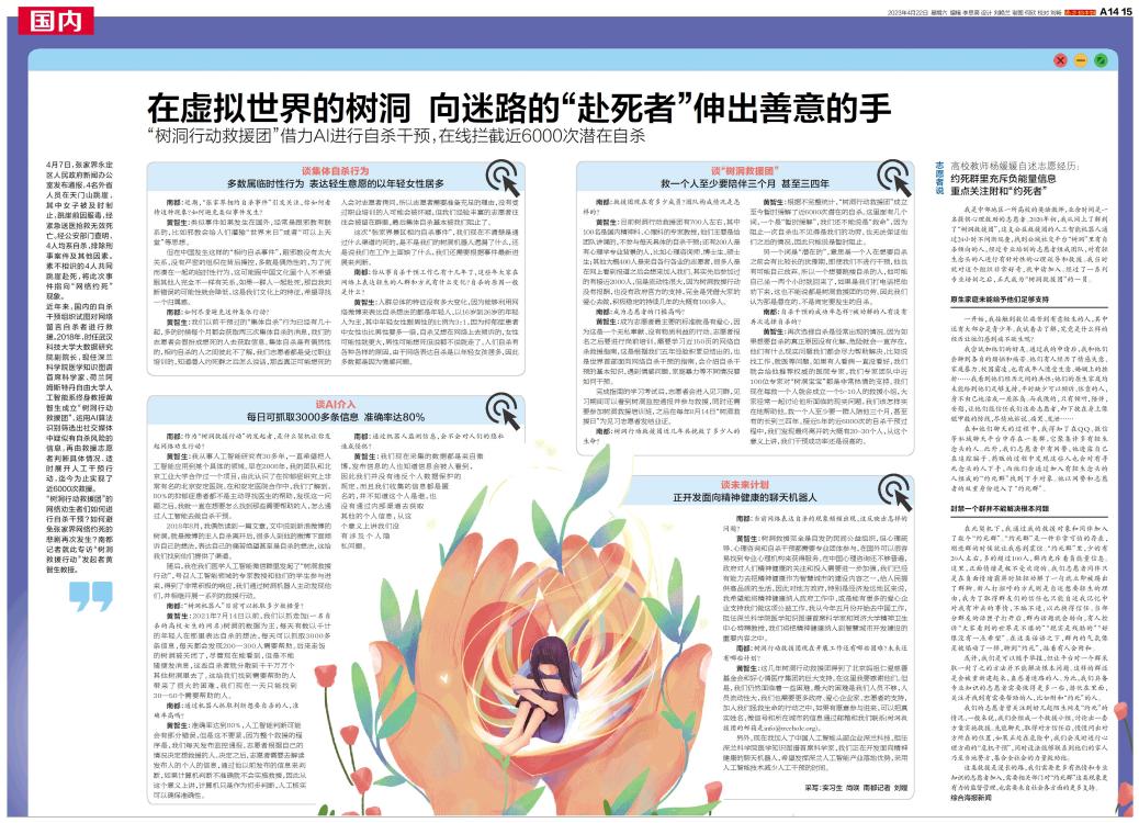 近年来,国内的自杀干预组织试图对网络留言自杀者进行救援。2018年,时任武汉科技大学大数据研究院副院长,现任深兰科学院医学知识图谱首席科学家、荷兰阿姆斯特丹自由大学人工智能系终身教授黄智生成立“树洞行动救援团”,运用AI算法识别筛选出社交媒体中疑似有自杀风险的信息,再由救援志愿者判断具体情况、适时展开人工干预行动,迄今为止实现了近6000次救援。