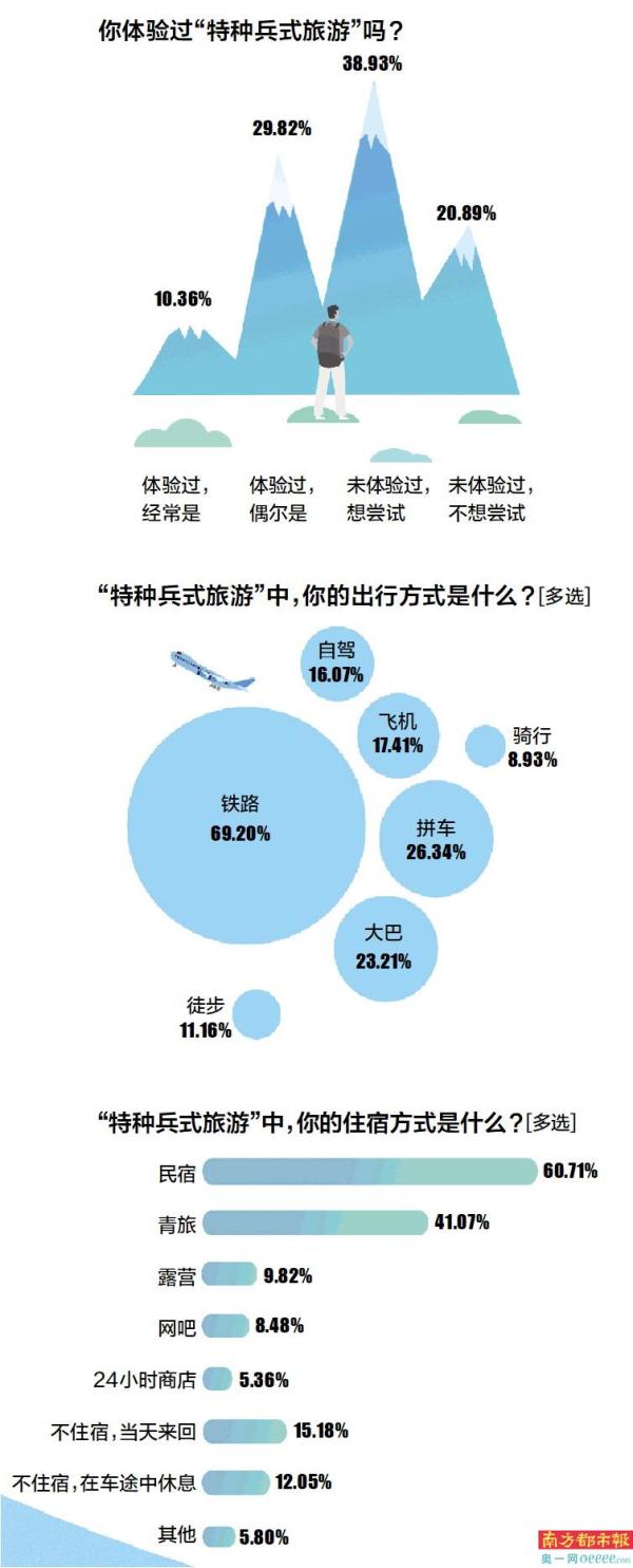 南都大数据研究院调查数据显示,82.86%的受访青年表示有留意到近期“特种兵式旅游”风靡年轻群体的现象。40.18%的受访青年表示当过“旅游特种兵”;38.93%表示未体验过但想尝试。