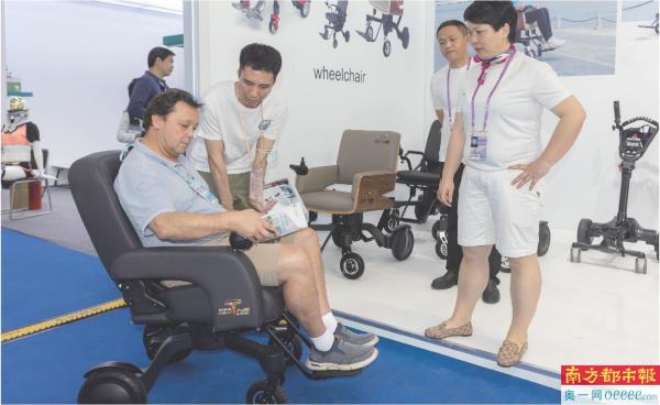 5月1日,广交会第三期医疗器械展馆,一名外商在体验电动轮椅。南都记者黎湛均 摄