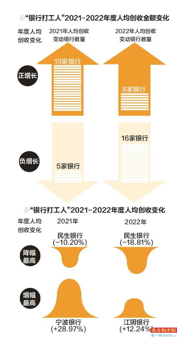 从人均创收来看,2022年人均创收出现负增长的银行是2021年的3倍还多,达到了16家。