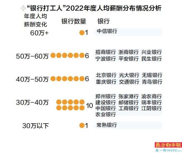 “金融降薪”话题热度居高不下,银行“金饭碗”的固有印象逐渐被打破。“银行打工人”薪资下降了吗?银行高管薪酬又如何变动?24家上市银行在2022年报中披露了薪酬相关数据。南都大数据研究院梳理发现,24家银行中7家银行员工年度薪酬下降,比2021年多了5家,但降薪未成主流。当中,中信银行员工人均年薪最高,其次是招行、浙商银行,都超过了58万元。此外,多家银行高管的薪酬大幅下行,中信银行高管薪酬腰斩。