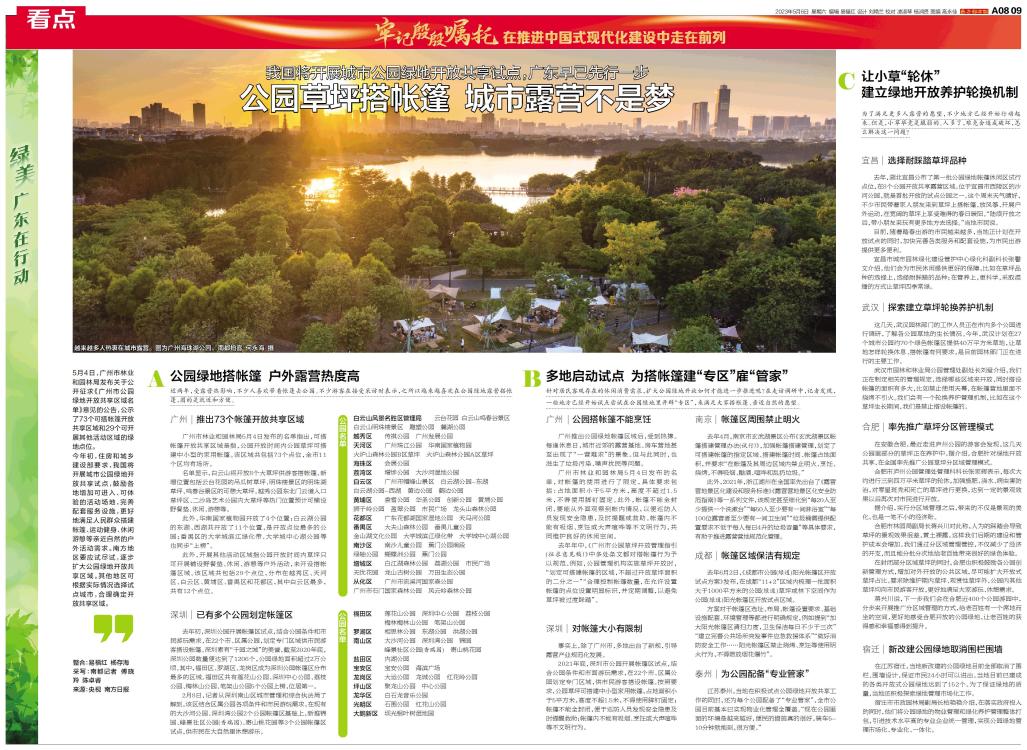 今年初,住房和城乡建设部要求,我国将开展城市公园绿地开放共享试点,鼓励各地增加可进入、可体验的活动场地,完善配套服务设施,更好地满足人民群众搭建帐篷、运动健身、休闲游憩等亲近自然的户外活动需求。南方地区要应试尽试,逐步扩大公园绿地开放共享区域。其他地区可根据实际情况选择试点城市,合理确定开放共享区域。