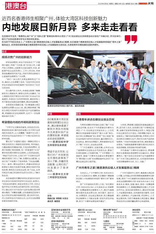 五四青年节当天,“青春同心来广州”之“创科之路”香港创科青年大湾区(广州)创业就业交流考察活动分别在广州南沙区、天河区举行,吸引了近百名香港中学与大学的师生参加。