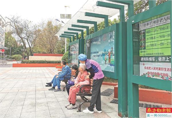 这座“公交站”坐落在大楼门前,由木色长椅和绿色站牌组成。它起初建在广州市老人院的康复花园里时只有一块站牌。2005年左右,随着慈慧大楼建成,它也完成了升级改造。“因为太逼真,有时家属也会在这里等车。”刘敏笑着对南都记者说。