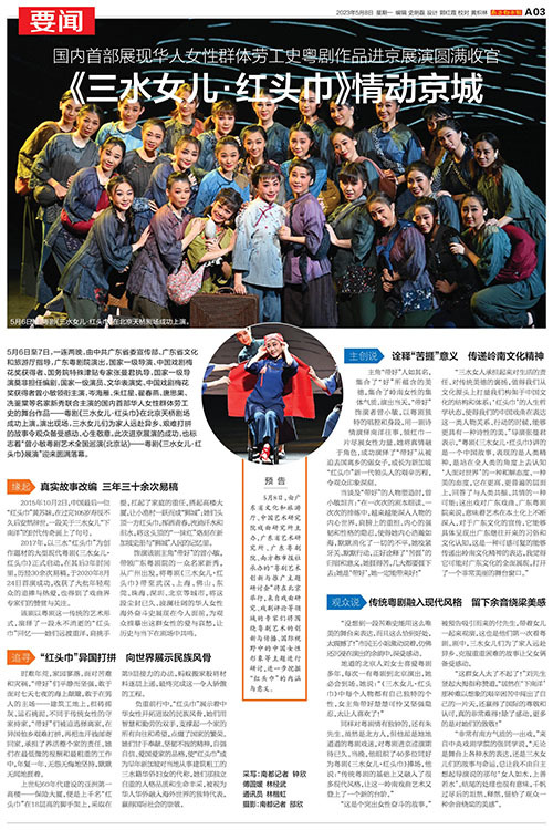 5月6日至7日,一连两晚,国内首部华人女性群体劳工史的舞台作品——粤剧《三水女儿·红头巾》在北京天桥剧场成功上演。