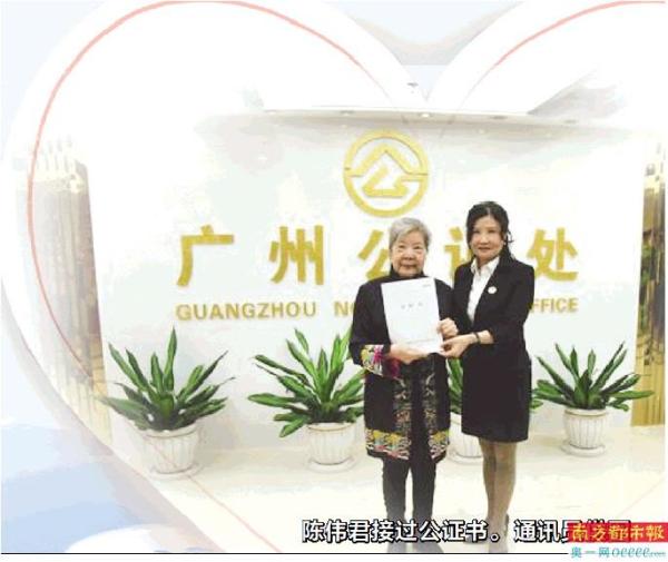 “感谢广州公证处免费为我办理公证,让我多年的心愿得以实现!”接过公证书的陈伟君激动地说。广州公证处主任邝志强表示,“这是广州公证行业有史以来,明确赠予国家用于公益、财产数额最大的一份遗嘱公证。”