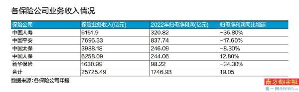 从保费业务收入来看,2022年,五家A股上市险企合计实现保险业务收入25725.49亿元,其中,中国人寿、中国平安、中国太保、中国人保、新华保险分别实现保险业务收入6151.9亿元、7696.33亿元、3988.18亿元、6258.09亿元、1630.99亿元。