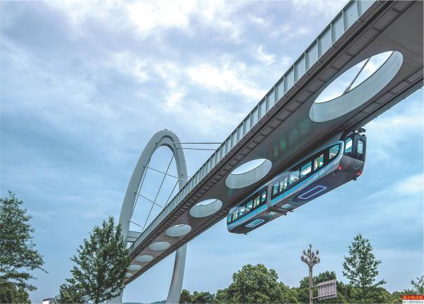 它将地面交通移至空中,属于立体交通,拥有独立路权,不受地面其他交通工具和行人干扰,是一种绿色低碳的城市轨道交通新制式。具有不占用地面路权、环境适应性强等优点,兼具通勤和观光功能。
