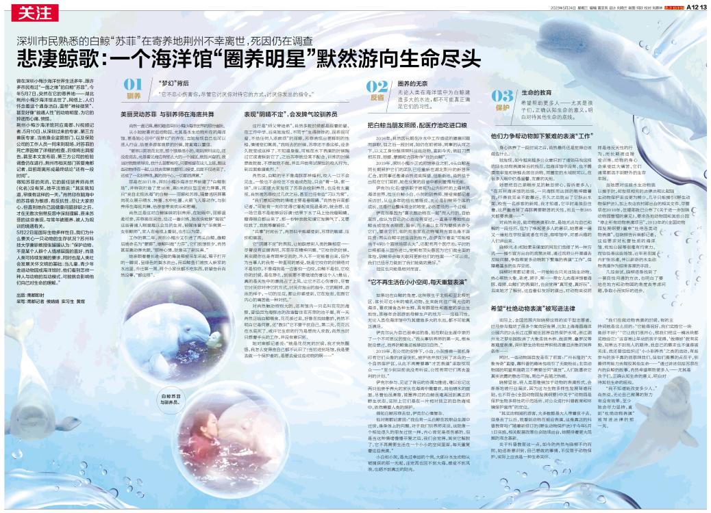 曾在深圳小梅沙海洋世界生活多年、跟许多市民有过“一面之缘”的白鲸“苏菲”,今年5月7日,突然在它的寄养地——湖北荆州小梅沙海洋馆去世了。