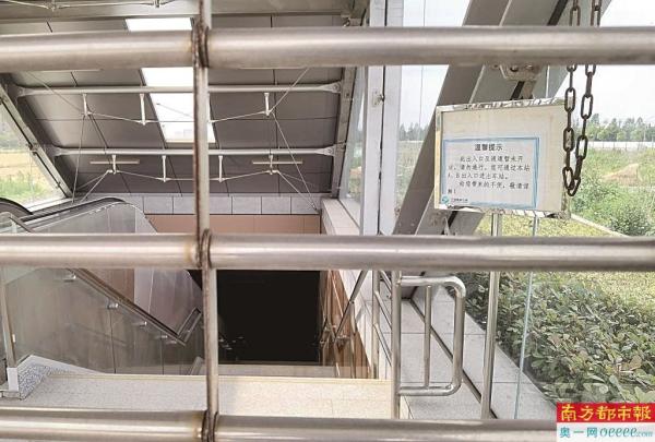 大门紧锁的高塘桥站D出口。站内公告牌上提示,“此出入口及通道暂未开放,请勿通行”。