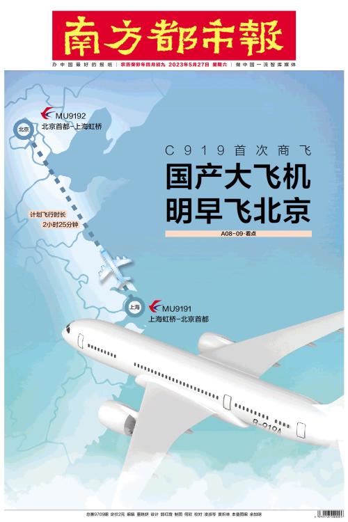 5月28日东航C919(编号为B-919A)首个商业航班飞行计划公布,班次为MU9191上海虹桥-北京首都,MU9192北京首都-上海虹桥,计划飞行时长2小时25分钟。