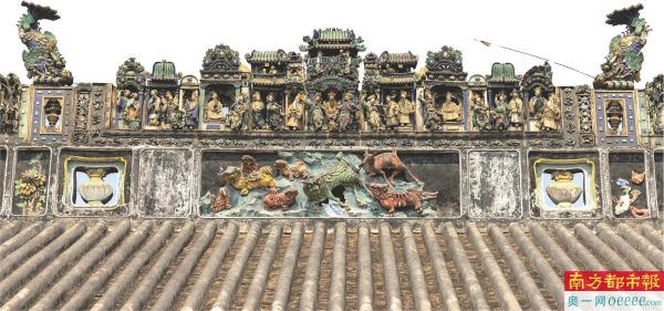 曹雪留意到,其中最具代表性的作品之一,是十一条高置于屋顶之上的陶塑脊饰,出自广东佛山石湾。每条脊饰以粤剧故事为主要题材,场景、人物形态各异,成百上千座陶塑群像波澜起伏,连绵而成一方恢弘壮丽的“高空戏台”。