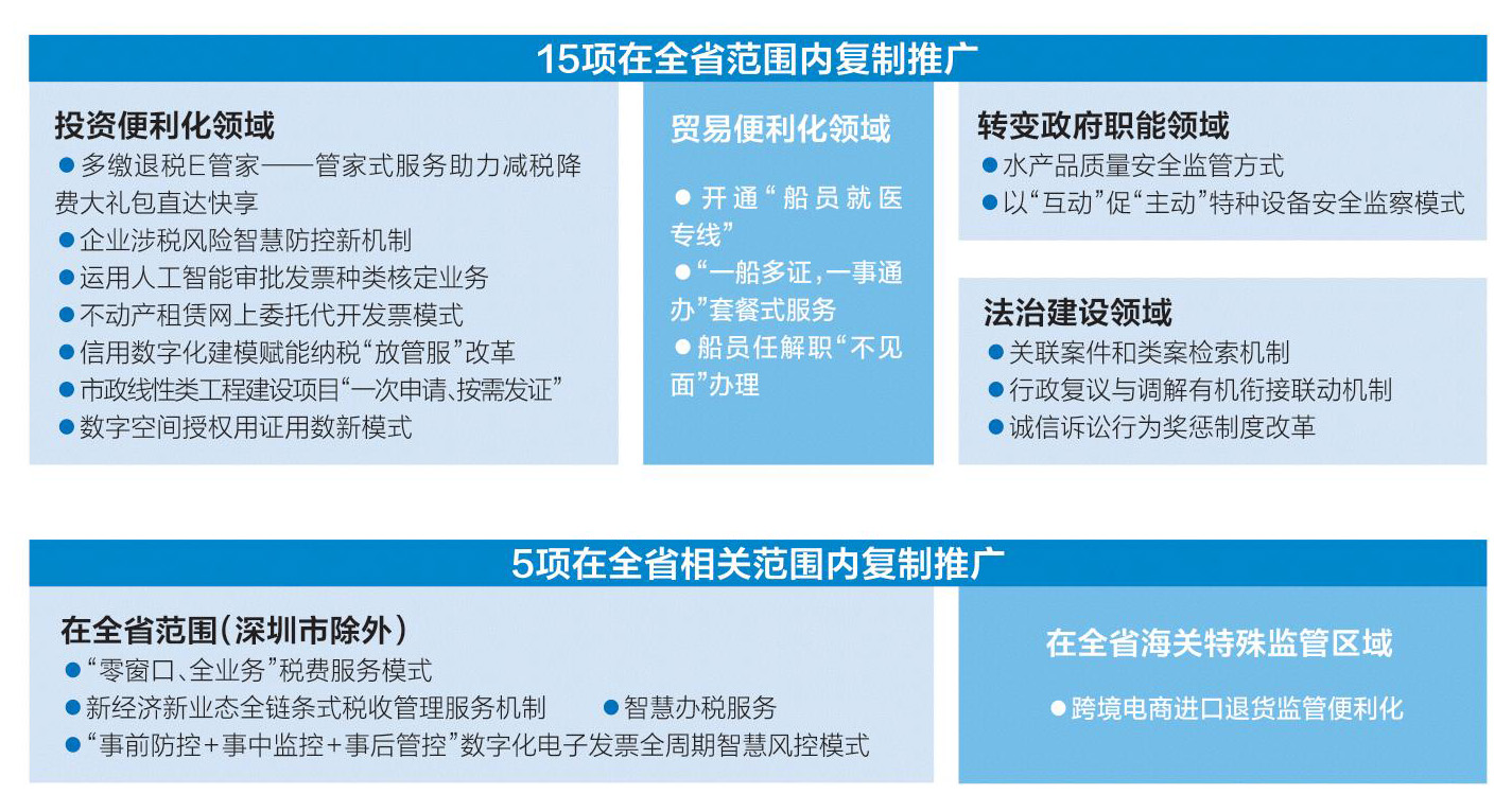 其中,15项改革事项在全省范围内复制推广。其余5项改革事项将在全省相关范围复制推广。多项改革瞄准降本增效,将为更多企业和群众办事提供便利。比如,在“运用人工智能审批发票种类核定业务”这项改革中,税务部门创新运用人工智能技术,实现发票种类核定业务规则数字化、审批自动化,以无间断审批方式,将每户纳税人审批时间压缩至1-2分钟;“数字空间授权用证用数新模式”改革中,省政务服务数据管理局依托省数据资源“一网共享”平台和数字空间,构建基于数据主体授权的数据共享应用模式,发布个人和法人数字空间,实现“授权用数、全程溯源、自主管理、依法流通”。 南方+记者 陈晓