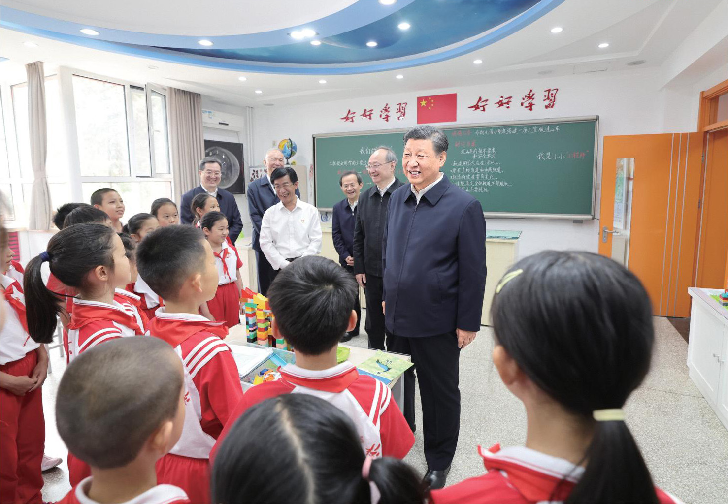 习近平随后来到五年级教师办公室,看望正在研讨备课的老师们,询问课后服务课程结构设置等情况。习近平指出,中国特色社会主义教育体系是好的,我国的基础教育在世界上是有优势的,要坚定文化自信,把自己好的东西坚持好,把国外好的东西借鉴好,与时俱进、开放发展,让孩子们有更广阔的眼界、更开阔的思路、更开放的观念,努力培养堪当民族复兴重任、勇于创造世界 奇迹的国之栋梁。习近平强调,人才培养,关键在教师。广大教师要牢记为党育人、为国育才的初心使命,以人民教育家为榜样,以德立身、以德立学、以德施教。要在全社会营造尊师重教的良好风尚,让教师成为最受社会尊重和令人羡慕的职业,努力形成优秀人才争相从教、优秀教师不断涌现的良好局面。