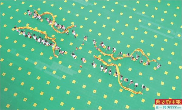 5月30日,在河北省唐山市一家幼儿园,孩子们在表演舞龙节目。