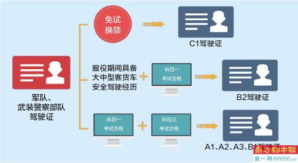 在推行持军队、武装警察部队驾驶证免试换领小型汽车驾驶证基础上,对申请换领大型货车准驾车型驾驶证,服役期间具备一定大中型客货车安全驾驶经历的,参加科目一考试合格后予以换证,不再需要参加科目三考试,更好服务保障退役军人就业从业(见下图图示)。