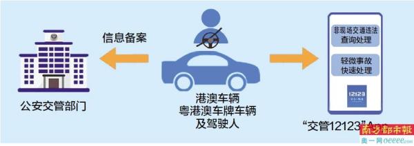 香港和澳门特别行政区临时入境机动车、粤港澳两地牌车辆及其驾驶人在公安交管部门备案后,可通过“交管12123”App查询处理机动车非现场交通违法,快速处理轻微交通事故,便利港澳居民在内地驾车出行(见下图图示)。