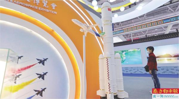 往届文博会的珠海展台,一小男孩驻足观看神舟火箭模型。