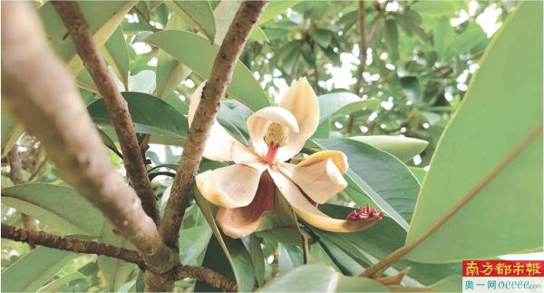 记者看到,在南昆山保护区的“蜻蜓馆”旁,一棵长梗木莲树高约5米,树旁立着一块招牌,写着“自然保护区珍稀濒危特有保护树种”。树上的花朵渐次绽放,花朵完全绽放时约手掌大小,花瓣白色,雄蕊和花丝为红色;雌蕊群淡黄绿色,十分美丽。