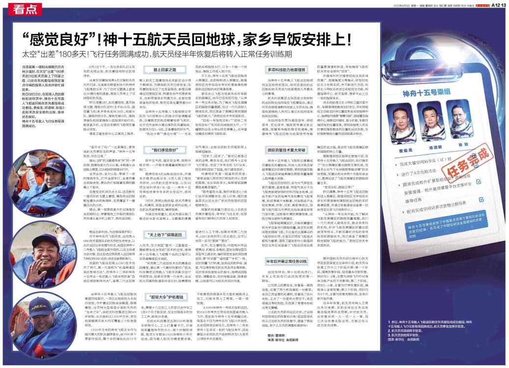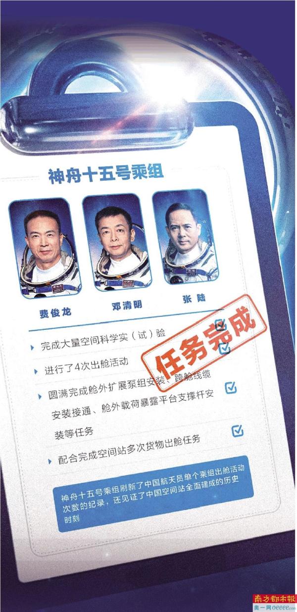 圆满完成4次出舱活动任务,开展多次载荷出舱任务、8项人因工程技术研究、28项航天医学实验,以及38项空间科学实(试)验……神舟十五号乘组结束半年多的太空远行、顺利返航。