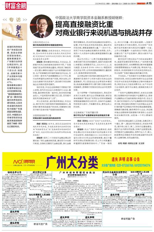 围绕着商业银行在服务制造业企业中的竞争环境,“提高直接融资比重”这一要求对金融机构带来的机遇与挑战,以及未来金融机构如何有力赋能广东高质量发展等话题,近日,中国政法大学商学院资本金融系教授胡继晔接受了南都·湾财社记者的专访。