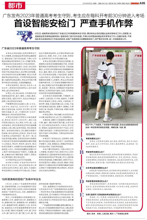 6月2日,省教育考试院发布《广东省2023年普通高考考生守则》,要求考生必须自觉服从监考员等考试工作人员管理,自觉接受监考员使用金属探测仪、智能安检门进行安全检查,不得以任何理由妨碍监考员等考试工作人