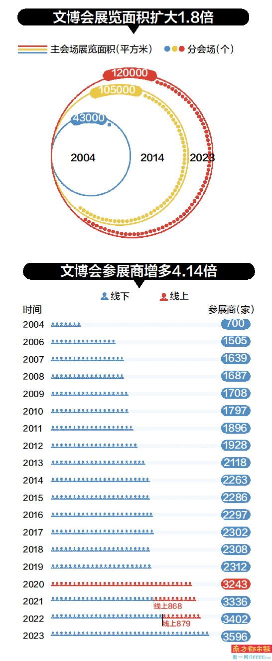 根据文博会官网数据统计,文博会参展商从首届的700多家到今年的3596家,十九年来增加了4.14倍;总参观人数从首届的47.7万人到疫情前2019年的700万,增加了13.68倍。受新冠肺炎疫情影响,2020年第十六届文博上云上举行,第十七届、第十八届采用线下为主、线上同步的方式举办,线下参观人数最多达到205万,比首届增加了3.3倍。