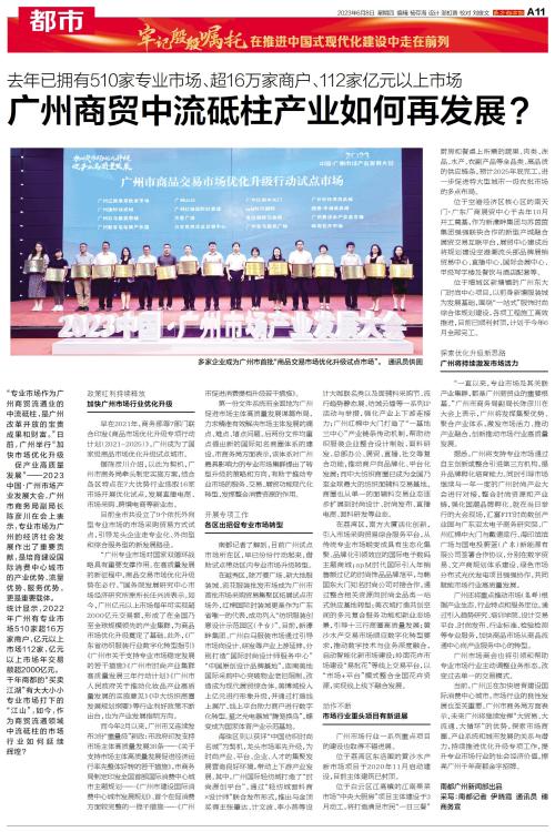 “专业市场作为广州商贸流通业的中流砥柱,是广州改革开放的宝贵成果和财富。”日前,广州举行“加快市场优化升级 促产业高质量发展”——2023中国·广州市场产业发展大会,广州市商务局副局长陈彦川在会上表示,专业市场为广州的经济社会发展作出了重要贡献,是培育建设国际消费中心城市的产业优势、流量优势、服务优势,更是重要载体。
