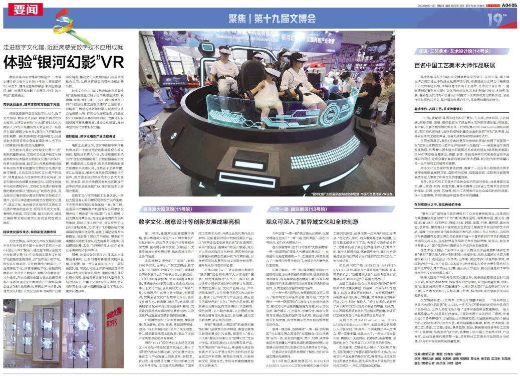 数字化是今年文博会的特色之一。本届文博会设立数字文化馆(9号馆),展览面积2万平方米,馆内设置媒体融合·新闻出版展区、慧广电展区和电影工业展区,专设“数字中国”主题展区。