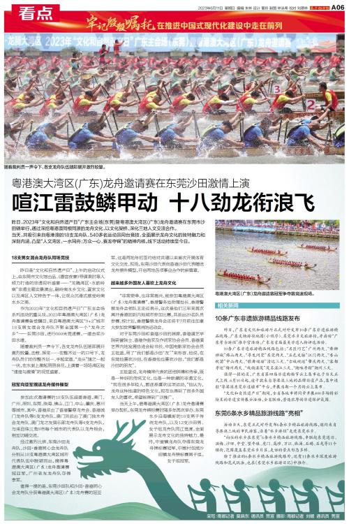 昨日,2023年“文化和自然遗产日”广东主会场(东莞)暨粤港澳大湾区(广东)龙舟邀请赛在东莞市沙田镇举行。