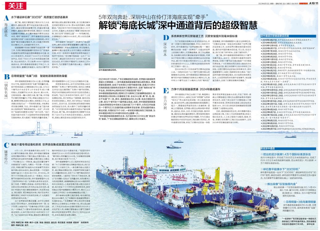 隧道基槽开挖是沉管管节安装的第一道工序。负责沉管隧道基槽开挖的中交广航局深中通道项目部常务副经理杨景鹏告诉记者,自2019年起至今,共完成了3500万立方米的疏浚作业,完成了约26.5万立方米的海底礁石破除。挖出来的泥沙,可以装满14000个国际标准游泳池。深中通道海底隧道位于珠江口,水文泥沙复杂、基槽回淤强度大,本次E23管节及最终接头隧址清淤要求更高,龙口区清淤操作空间被压缩至长167米、宽46米的范围内。杨景鹏说:“该区域内不到半年就回淤高达1.88万立方米,在基床上形成类似‘糨糊’的板结沉积物。我们应用‘深海吸尘器’——专用清淤船,开展精准定点清淤6000余次,用14天完成清淤任务。”