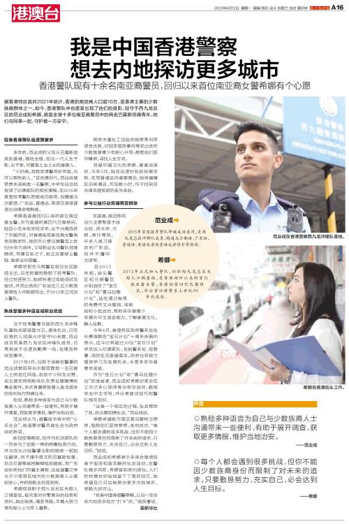 据香港特区政府2021年统计,香港的南亚裔人口超10万,是香港主要的少数族裔群体之一。如今,香港警队中也逐渐出现了他们的身影。驻守于西九龙总区的范业成和希娜,就是全港十多位南亚裔警员中的两名巴基斯坦裔青年。他们与同事一起,守护着一方安宁。