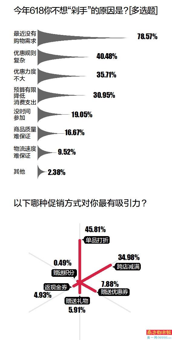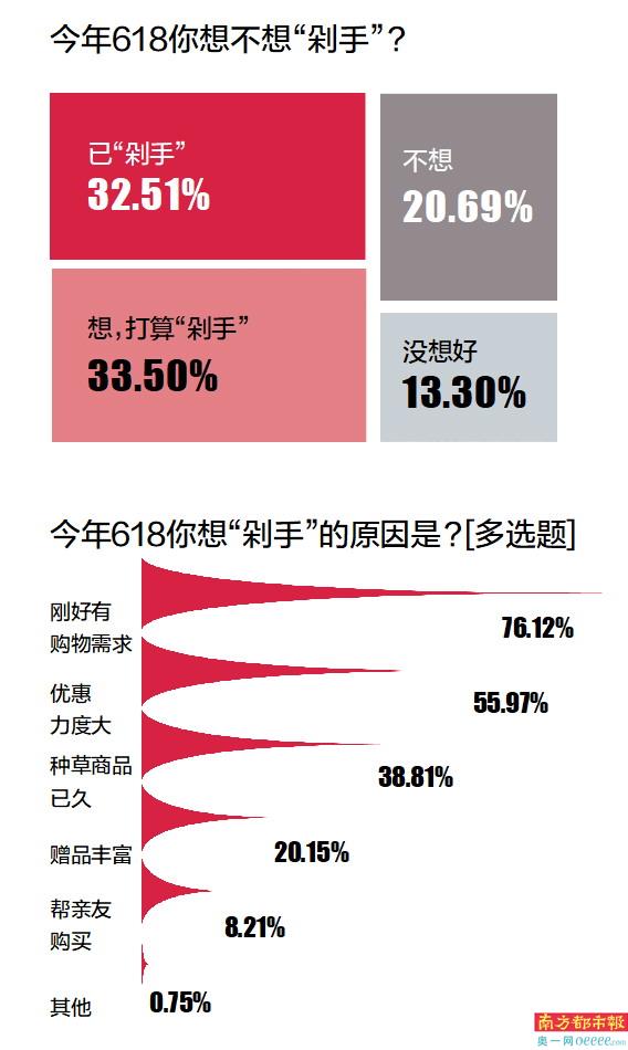 年轻人在这波年中大促中“剁手”了吗?南都大数据研究院调查数据显示,32.51%受访青年已“剁手”,还有三成人有购物意愿。提及想在618购买商品的原因,76.12%有购买意愿的受访青年表示自己刚好有购物需求;55.97%认为本次618的优惠力度大;近四成种草商品已久,专门留到618清空购物车。有受访者表示,自己种草心仪商品已久,趁着618打折买了下来,购买的商品全部次日达,较往年快了不少。