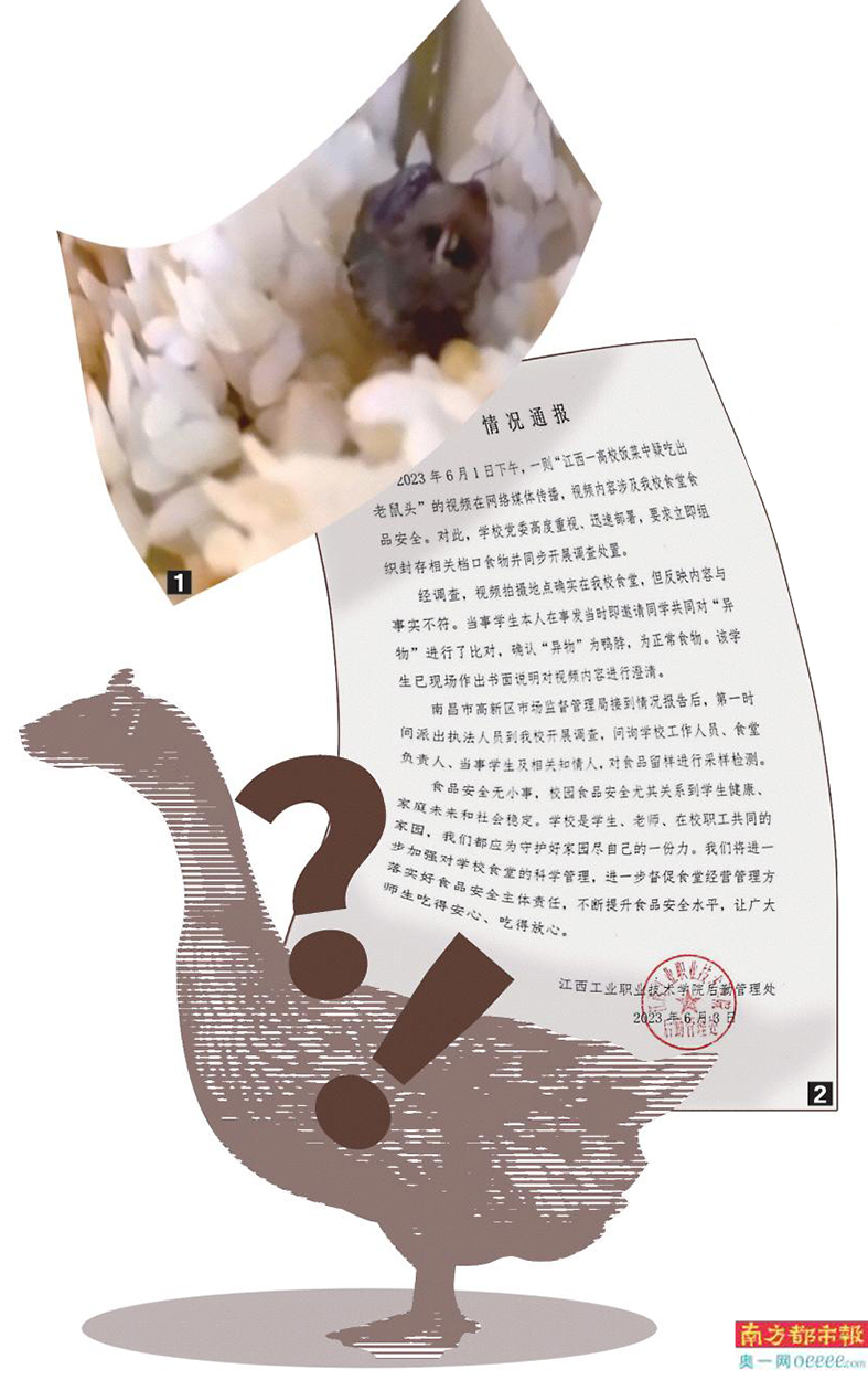针对此段视频,6月3日晚,涉事方江西工业职业技术学院官方微博发布一则情况通报。通报称,事发时,拍摄视频的学生本人和同学对“异物”进行了比对,确认“异物”为鸭脖,系正常食物。通报还称,这位学生已经现场作出说明,对视频内容进行澄清。