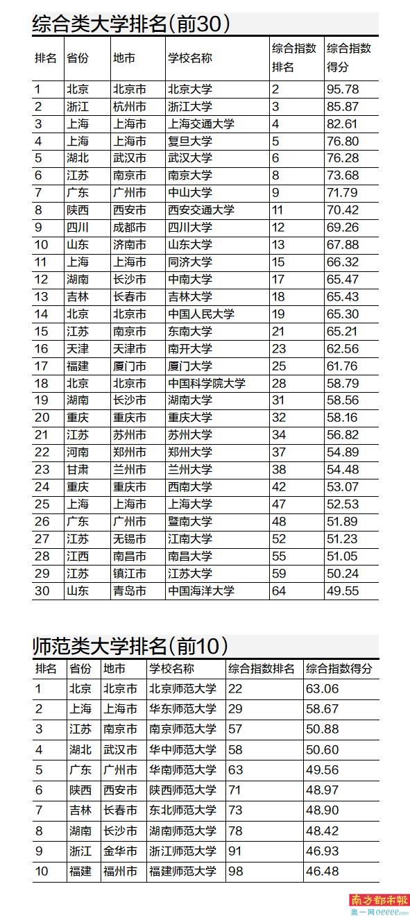 北京师范大学、华东师范大学、南京师范大学、华中师范大学、华南师范大学位居前五。