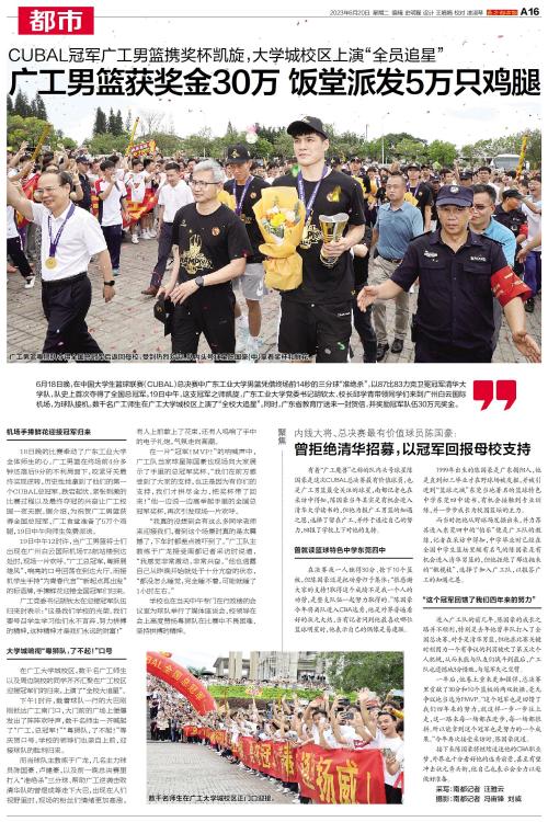广工男篮获奖金30万 饭堂派发5万只鸡腿