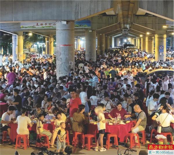 广州市海珠区的小洲村昨晚宴开超过600围龙船饭,其中400多围在南沙港快速路高架桥底开摆。场面气氛热烈,敬酒喝彩此起彼伏。据了解,小洲村昨天除招呼本村村民、兄弟村代表、老表村代表外,全省各地乃至部分省外简氏宗亲代表也前来赴约。