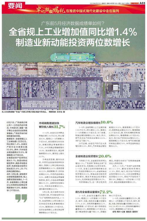 6月21日,广东省统计局公布1—5月经济运行简况。今年前5月,随着一揽子惠企业益民生政策精准落地,广东经济运行延续恢复向好态势。