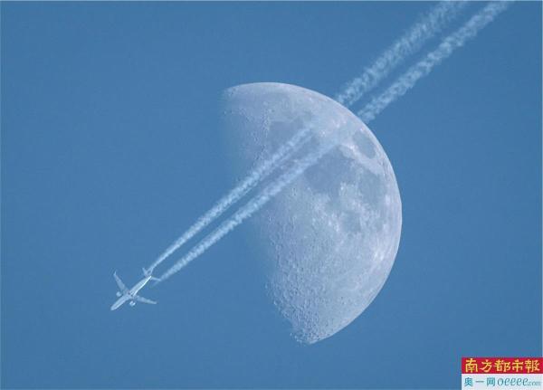 5月28日,在德国法兰克福上空,一架双引擎飞机从月亮下飞过。 新华社发
