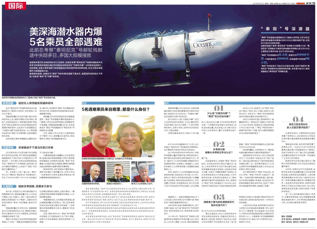 美国海岸警卫队当地时间6月22日宣布,此前在考察“泰坦尼克”号邮轮残骸途中失踪多日的美国深海潜水器已在沉船地点附近发生“灾难性内爆”,5名乘员全部死亡。