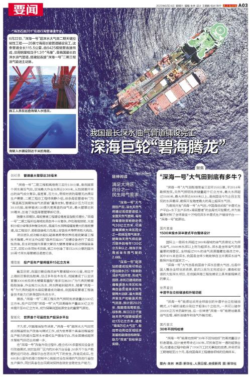 6月22日,“深海一号”超深水大气田二期关键控制性工程——20英寸海底长输管道铺设完工。