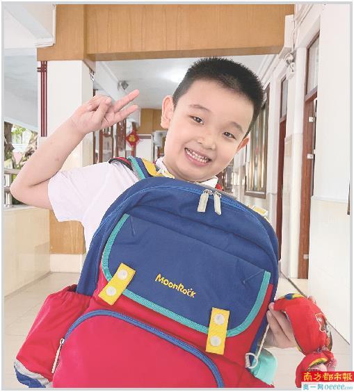 一年级学生黄邦峻的书包挂着防疫香囊,有空就会闻一闻。
