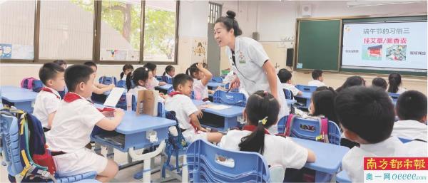 广东省中医院的医生跟孩子们交流挂艾草、佩香囊等端午节民俗。