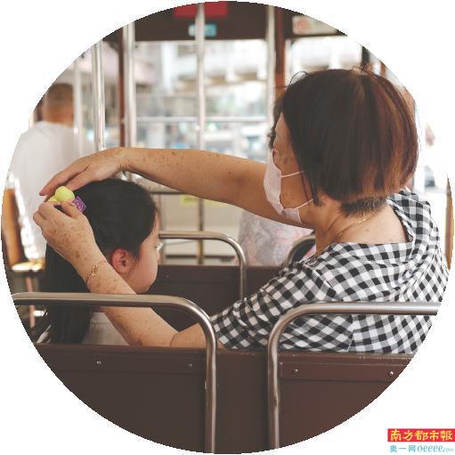 5月5日,在香港的一辆“叮叮车”上,一名市民为小朋友扎头发。