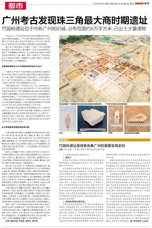 6月25日,广州市文物考古研究院发布最新考古成果:经考古勘探发掘确认,广州竹园岭遗址商时期遗存分布范围约8万平方米,核心区域分布范围约1.5万平方米,是目前珠江三角洲地区考古发现确认的面积最大的商时期遗址。