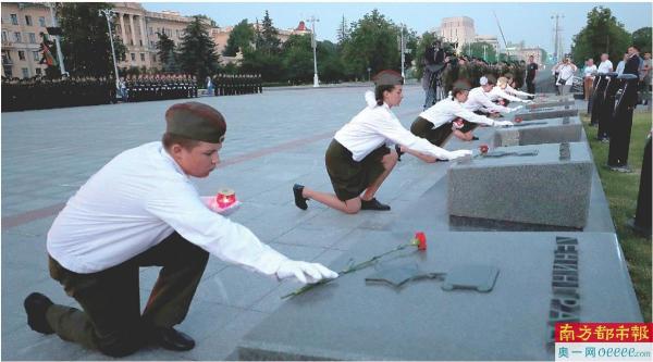 2021年6月22日,学生们在白俄罗斯首都明斯克向胜利纪念碑献花。 新华社发