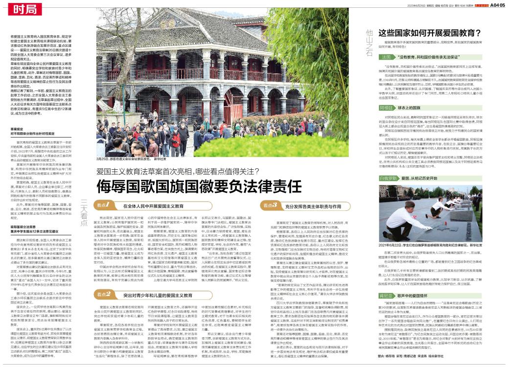 爱国主义教育法草案26日首次提请十四届全国人大常委会第三次会议审议,诸多规定值得关注。